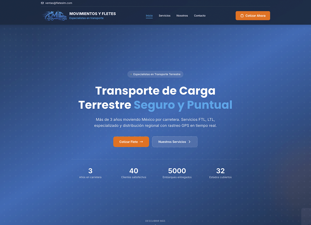 Sitio web corporativo para Movimientos y Fletes LM, empresa especializada en transporte terrestre de carga con más de 3 años en operación. Diseño enfocado en captación de clientes con cotizador, catálogo de servicios (FTL, LTL, especializado, distribución regional, despacho aduanal) y rastreo GPS en tiempo real.